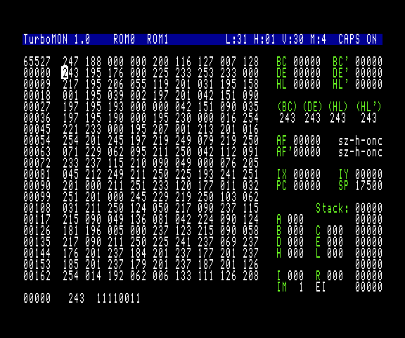 TurboMON is a Z80 monitor and toolkit for the SAM Coupé. It provides a controlled execution environment for SAM programs, supporting single-stepping, tracing, breakpoints, as well as a selection of utility functions.