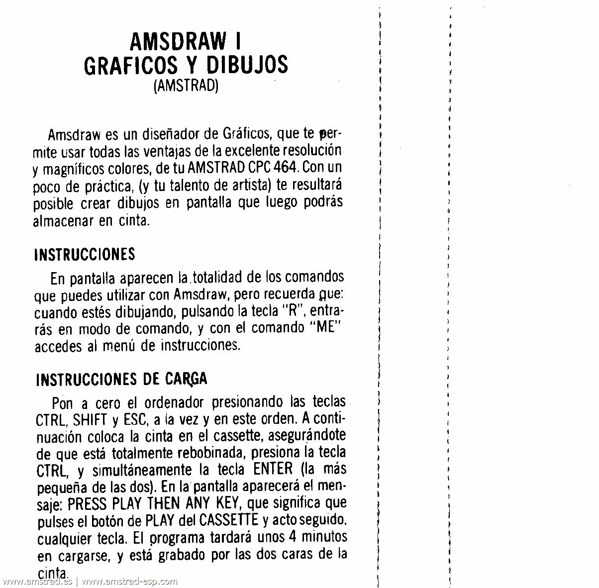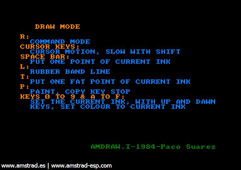 La versión cinta corresponde a la versión castellana publicada en España. Este singular programa de dibujo formaba parte del pack de regalo que acompañaba a los Amstrad CPC en sus primeras series. Curiosamente el programa, realizado en Basic, es accesible. Como se puede observar el programa se llama Amdraw, sin embargo la caratula del mismo reza "Amsdraw" |