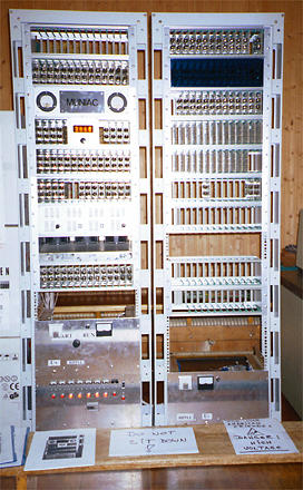 MUNIAC Andererseits hatte sich dort ein absolutes Unikat eingefunden: Der MUNIAC, ein von einem Münchner (John Zabolitzky) anno 2000 gebauter Röhrencomputer! Fast genauso beeindruckend wie die zwei hohen mit Röhren gefüllten 19"-Racks war die daneben aufgebaute Data General Konsole, die, obwohl Baujahr 1988, den Flair der 60er Jahre in sich trug.