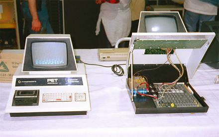 Die mittlere Tischreihe war stark Commodore-lastig: Hier hatte Hans Franke seine eigene Ausstellung "Die PET-Evolution" plaziert. Angefangen mit einem echten PET und CBM 2001 PET, gefolgt von einer CBM 2001 und weiteren CBMs wurde die Entwicklung der großen (dies ist wörtlich, d.h. räumlich zu verstehen) Commodore-Rechner aufgezeigt. Leider hatte Hans, da er ja in Personalunion Aussteller und Organisator war, wenig Gelegenheit, seine eigene Ausstellung zu kommentieren. Daher wurden die Rechner leider vom Publikum etwas vernachlässigt.